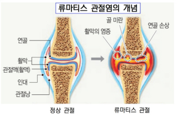 우리 몸은 외부의 나쁜 물질에 항상 노출되어 공격을 받고 있습니다. 하지만 우리가 건강하게 몸을 유지할 수 있는 것은 우리의 면역 세포들이 나쁜 물질의 침투를 막고 제거하기 때문입니다. 하지만 이 면역세포가 우리의 몸을 적으로 오인하고 공격하는 경우가 있는데, 이를 자가 면역질환이라고 부릅니다. 자가 면역 질환에는 여러가지 질병이 있는데, 면역세포가 관절 부분을 공격하여 염증이 발생하는 것을 류마티스 관절염이라고 부릅니다.
