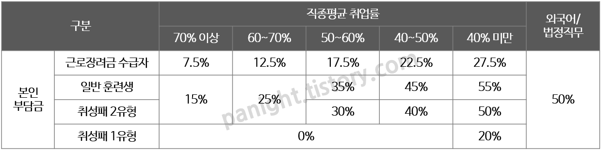교육훈련비, 학원수강비를 100% 지원받을 수 있을까요? 그것은 아닙니다. 본인부담금이라는 것이 있어, 자신이 직접 부담해야 하는 비용을 제외하고 지원받을 수 있습니다. 본인부담금은 해당 직종의 취업률에 따라 달라질 수 있습니다. 즉 직종 평균 취업률이 높을 경우 본인 부담금이 적어지는 것이지요. 또한 교육노동부에서 지역별 학원 취업률을 공개하고 기준 이상의 학원은 본인 부담금을 더 낮추어 준다고 합니다. (훈련기관의 직종평균 취업률이 60% 이상이면서 전국 직종평균 취업률보다 5% 이상 높을 경우 교육 훈련비 우대지원) 또한 국가기간 전략산업직종 및 일부 과정에 대해서는 교육 훈련비 전액을 지원합니다. 아래 표의 취성패는 취업성공패키지의 약자로, 만 18~69세의 저소득층 및 미취업, 청장년 취업 취약계층이라면 신청할 수 있는 취업지원 프로그램입니다. 취성패 1유형은 기초생활수급자, 중위소득 60% 가구원, 특정 취약계층이 해당되며, 2유형은 소득 무관 18~34세 청년층, 중위소득 100% 이하인 중장년층(35~69세)가 해당됩니다.