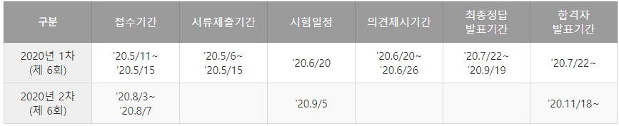 손해평가사 시험은 1년에 1회 시행되며, 1차 시험 합격 후 2차 시험을 치르게 됩니다. 시험은 2015년부터 시작하여 2020년 6회를 맞이하였으며, 2020년 1차 시험은 지난 6월 20일 실시되었으며, 2차 시험은 9월 5일 실시되었습니다. 2차 합격자 발표는 '20년 11월 1일 발표됩니다.
