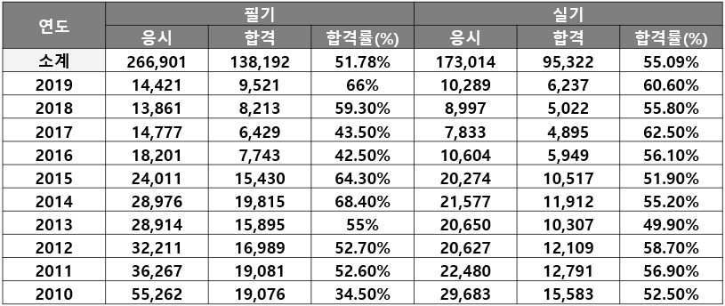 사무자동화산업기사 시험은 난이도가 높은 자격증 시험은 아니지만, 최근 10년간 필기시험 합격률이 52%에 불과할 정도로 합격률이 의외로 낮습니다. 이는 시험준비를 꼼꼼하게 하지 않으면 불합격 할 수 있다는 뜻인데요. 시험을 준비하는데 있어 가장 효율적인 공부방법 중 하나가 기출문제를 많이 풀어보는 것입니다. 여기에 최신 필기 기출문제 10회분을 올려드리니 필요하신 분은 다운받아 활용하시길 바랍니다. 또한 필기, 실기시험에 대한 최신 출제기준도 업로드 해드립니다.